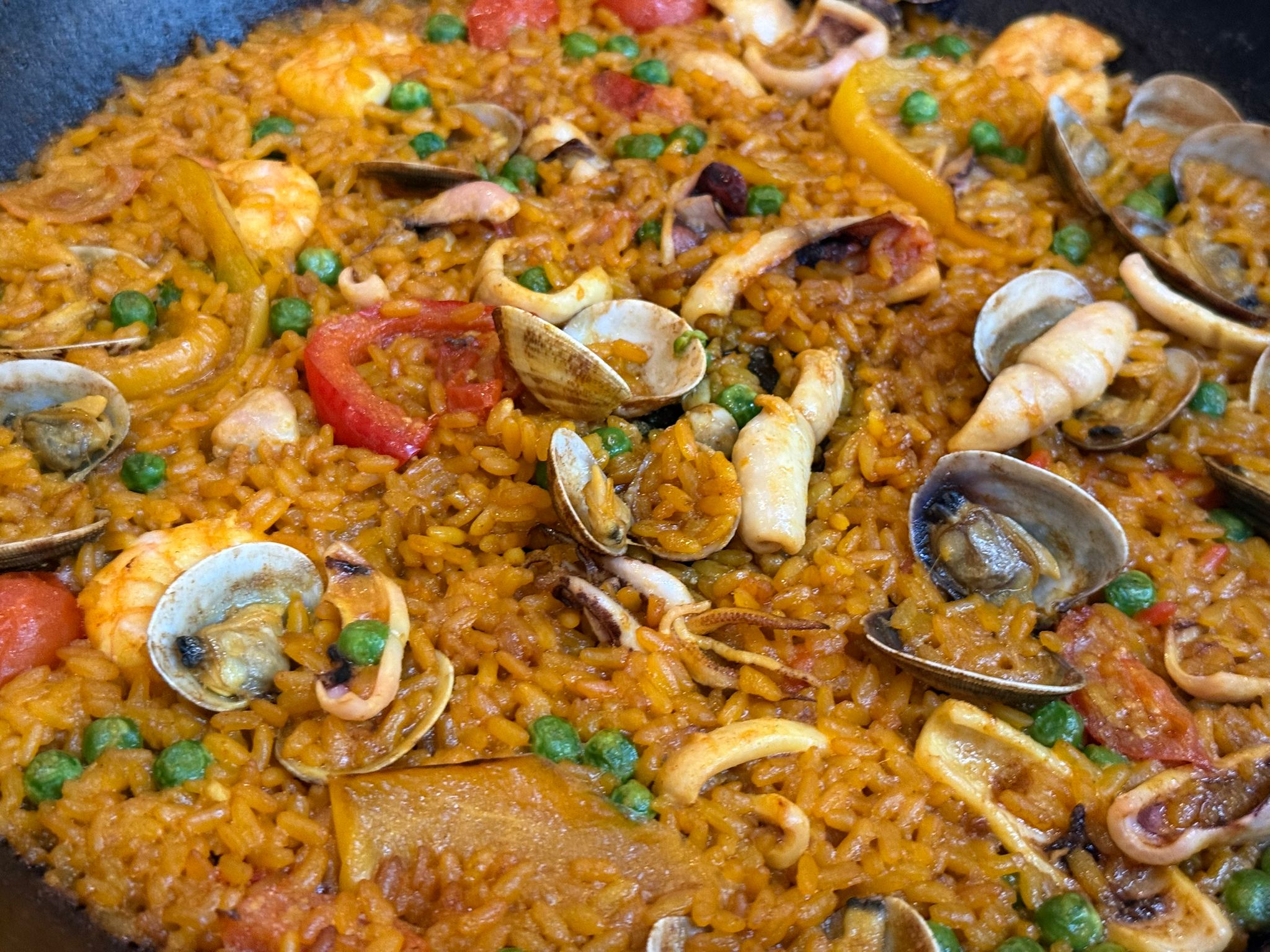 Paella alla marinara (senza cozze) accompagnata da 1884 Riserva 2020: una nota un po’ più verde rispetto al 2021 dovuta all’annata più fresca della precedente. Un anno di tonneau per il Merlot e un anno di cemento vetrificato per il Marzemino. Subito al naso il varietale del Merlot, poi frutta rossa, ciliegia, susina, mora, mirtillo e spezie dolci. Il sorso è fresco, saporito, ritorna la nota verde e il fruttato scuro. L’abbinamento con la paella è perfettamente riuscito, la tostatura del riso, fondo di crostacei, spezie dolci e umami creano una struttura capace di dialogare con il vino in un alternarsi di sensazioni.