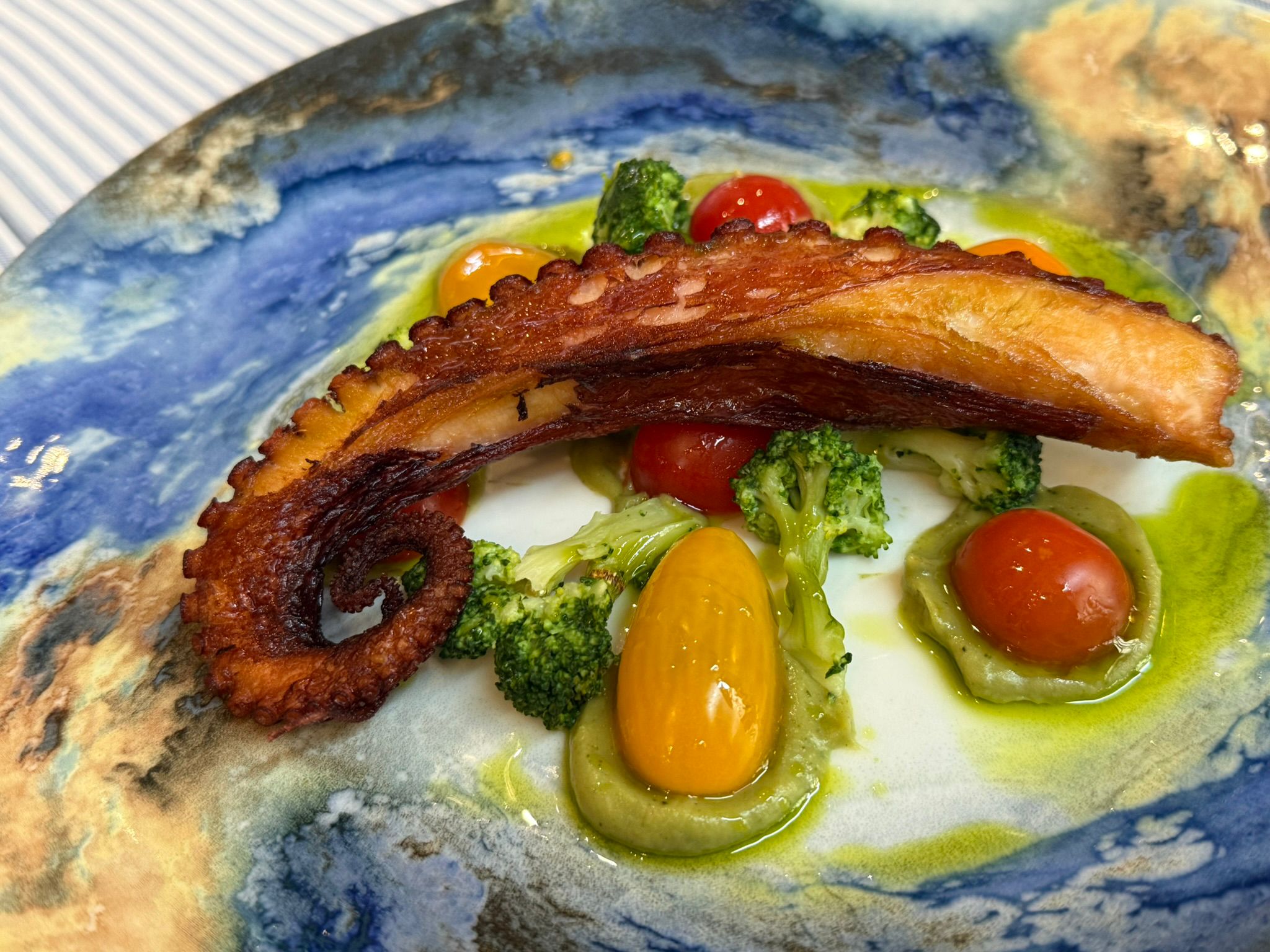 Polpo croccante con broccoletti alla diavolina e pomodori confit accompagnato da 1884 Riserva 2021: il 20% del Marzemino fa appassimento. Un bouquet improntato sulla frutta, ciliegia, mora, lampone, frutti di rovo e leggera nota di mallo di noce. Il sorso è giovane, ancora in tensione, ma estremamente piacevole con una morbidezza intrinseca, tannino scalpitante, discreta freschezza e buona PAI. Il collagene e la reazione di Maillard del polpo assorbono il tannino, l’amaro vegetale e il lieve piccante asciugano e allungano il sorso.
