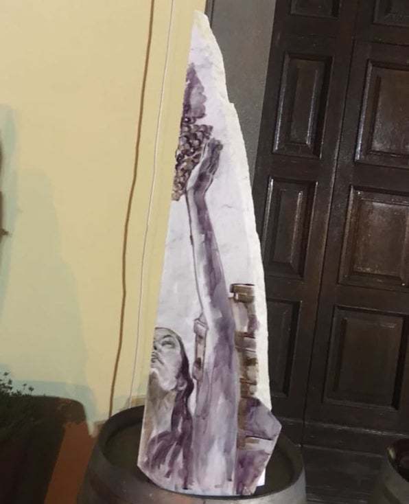 EnoArte sul marmo, pensato e non banale, e su tutto il concetto stesso del progetto espresso nella tecnica EnoArte, usare il vino per dare corpo all’immagine sognante di una donna, la magia di rendere leggera la pesantezza del marmo, farlo sembrare un battito d’ali rubato al vento, il non colore del vino che emoziona, leggero e iconico, il presente che narra il passato, la fantasia che ruba suggestioni ad un mondo fatto di civiltà e di storia a cui guardare, confrontarsi, apprendere.
