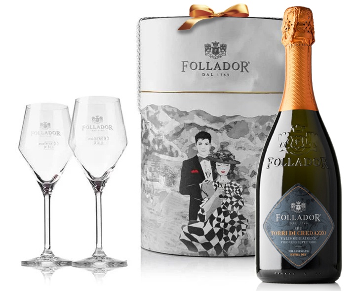 La cantina Follador ha pensato anche a chi sta cercando il regalo perfetto per sorprendere amici e parenti appassionati di vino, unendo all’interno di una cappelliera, una bottiglia di Valdobbiadene Prosecco Superiore e due eleganti calici.