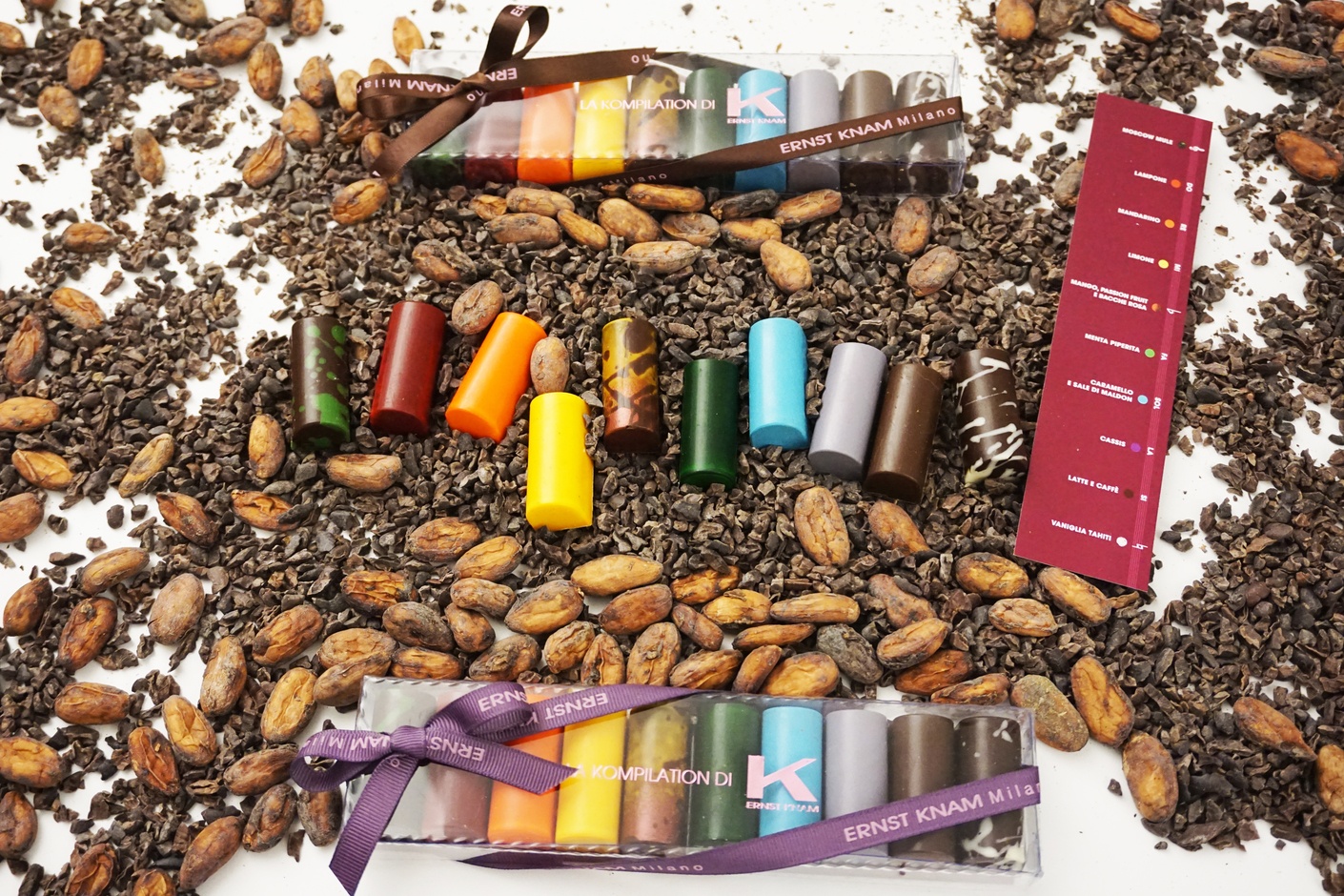 È così che nasce la KOMPILATION di ERNST KNAM, personale omaggio dello Chef alla riviera dei fiori e alla musica italiana: la classica confezione Knam in acetato crystal che racchiude 10 praline di colori e gusti differenti, con i nomi delle 7 note e i simboli chiave di violino, bemolle e diesis.