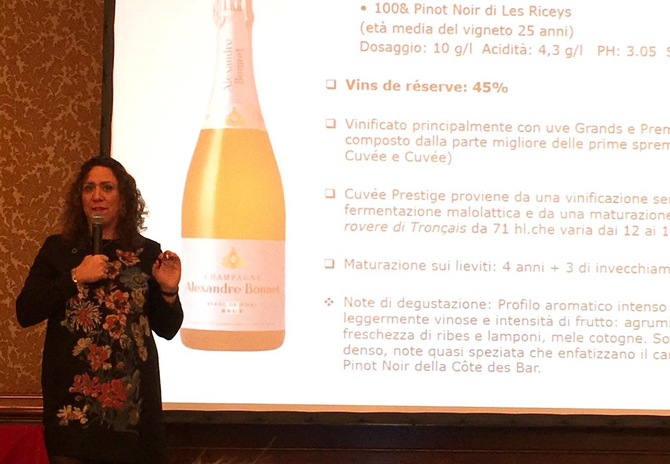 Chiara Giovoni, Ambassadeur 2012, ha aperto le danze con i vin de reserve che, attraverso gestione e conservazione, caratterizzano e rendono unico lo Champagne. Ogni Cantina ha il suo stile e suoi segreti: la cuvée parte sempre dall’ultima vendemmia e sulla base di questa si costruisce l’assemblaggio. Si hanno poi vini di annate precedenti, che le Maisons hanno scelto di conservare. Non va dimenticato che questi vini sono tutti potenziali Champagne AOC, ma che si decide di non spumantizzare per lasciarli affinare in cantina. Vini fermi, vin claires, sfecciati, conservati in vario modo: legno, vetro o acciaio. Sono vini usati per caratterizzare lo stile delle Maisons. Questo permette al consumatore di poter scegliere lo stile che preferisce a secondo del proprio gusto. La cuvée sans année è il vino più rappresentativo di ogni Azienda perché ne caratterizza lo stile e perché è la cuvée con tiratura più alta, ci ricorda Claudia Nicoli, Ambassadeur 2006, che ha parlato dell’importante lavoro sui millesimi.