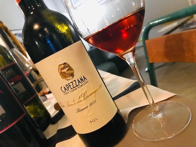 Villa di Capezzana 2016 Carmignano DOCG vino storico dell’azienda, la famiglia ha bottiglie dall’annata 1925. Sangiovese 80% e Cabernet Sauvignon 20%, l’affinamento avviene in tonneaux e in botte grande per circa 12 mesi. Naso fruttato dove spicca l’amarena e piccole erbe aromatiche come timo e rosmarino.