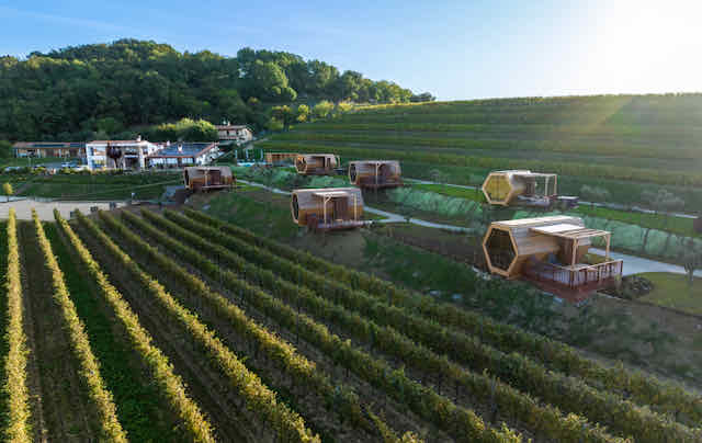 Oggi l’azienda Altùris ha da poco aggiunto un tassello al suo mosaico fatto di vigneti: una particolarissima struttura ricettiva immersa nel verde dei filari. La strada è distante, il traffico un lontano ricordo così come stress, rumori e confusione. Siamo in un luogo dove abbandonarsi al relax e al contatto con la natura: è Alvearium, Glamping Altùris, sulle colline di Cividale del Friuli, Udine.
