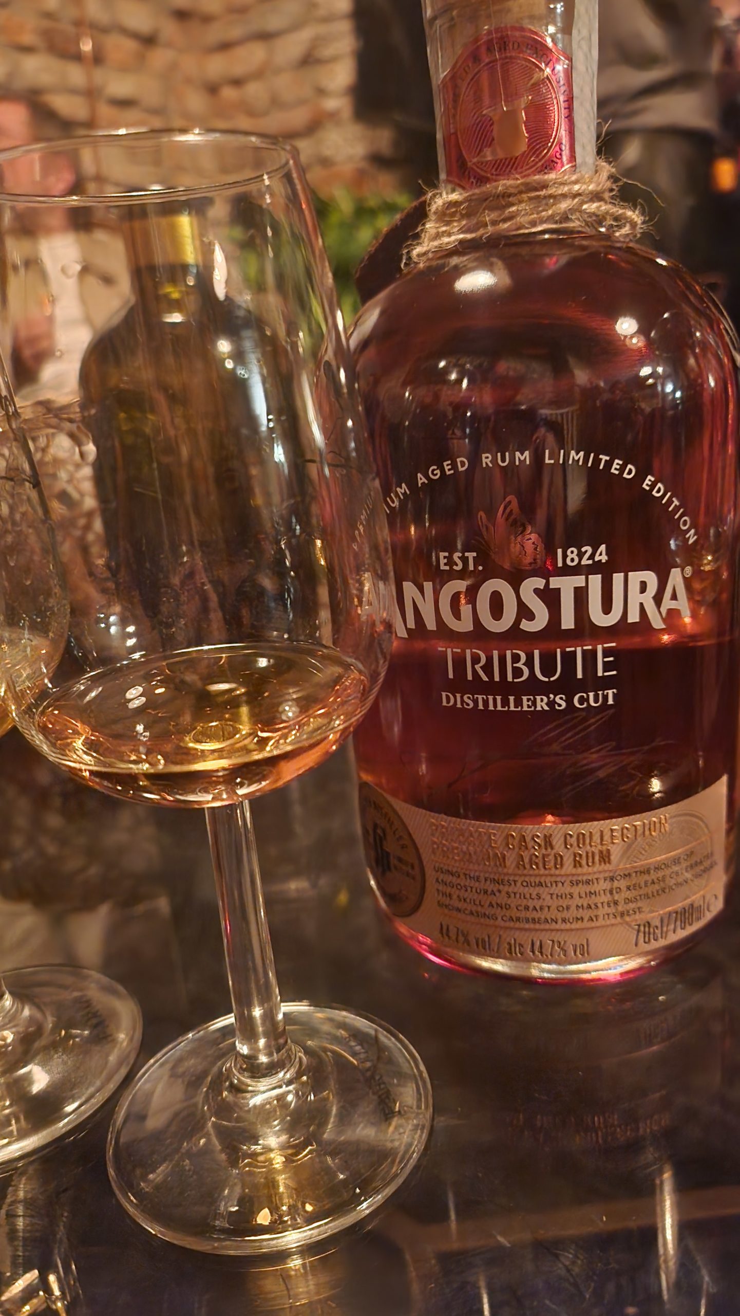 Il secondo Rum proposto è Angostura Tribute, un tributo a John Georges, per anni Master Distiller di House of Angostura. Importanti sono la qualità della materia prima, della melassa, che deve avere concentrazione di zucchero (indice Brix) superiore al 50% e la miscela di lieviti selezionati perfetta, che viene mantenuta inalterata da 65 anni. La distillazione continua a colonna deve portare alla gradazione alcolica di 44,7%, la stessa di Angostura Bitter. I profumi di ananas, mango, pesca, frutta matura e spezie invitano all’assaggio che sorprende con la lunga sequenza aromatica, con note di testa legate al legno e vanigliate, cuore di frutta tropicale che si definisce sempre più verso il mango e lunghissima coda speziata con emergenza di zafferano, come in una preziosa fragranza di profumeria.