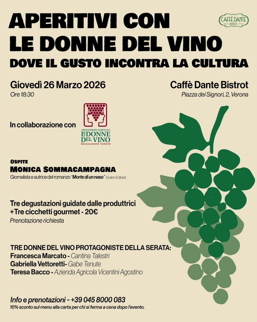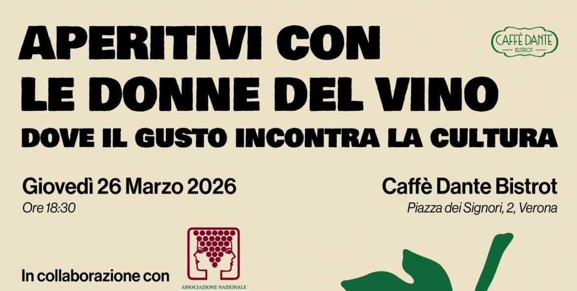 Al Caffè Dante Bistrot in Piazza dei Signori 2 a Verona debutta “Aperitivi con le Donne del Vino. Dove il Gusto incontra la Cultura”, una nuova rassegna di quattro aperitivi culturali ideata in collaborazione con l’Associazione Nazionale Le Donne del Vino – Delegazione Veneto.