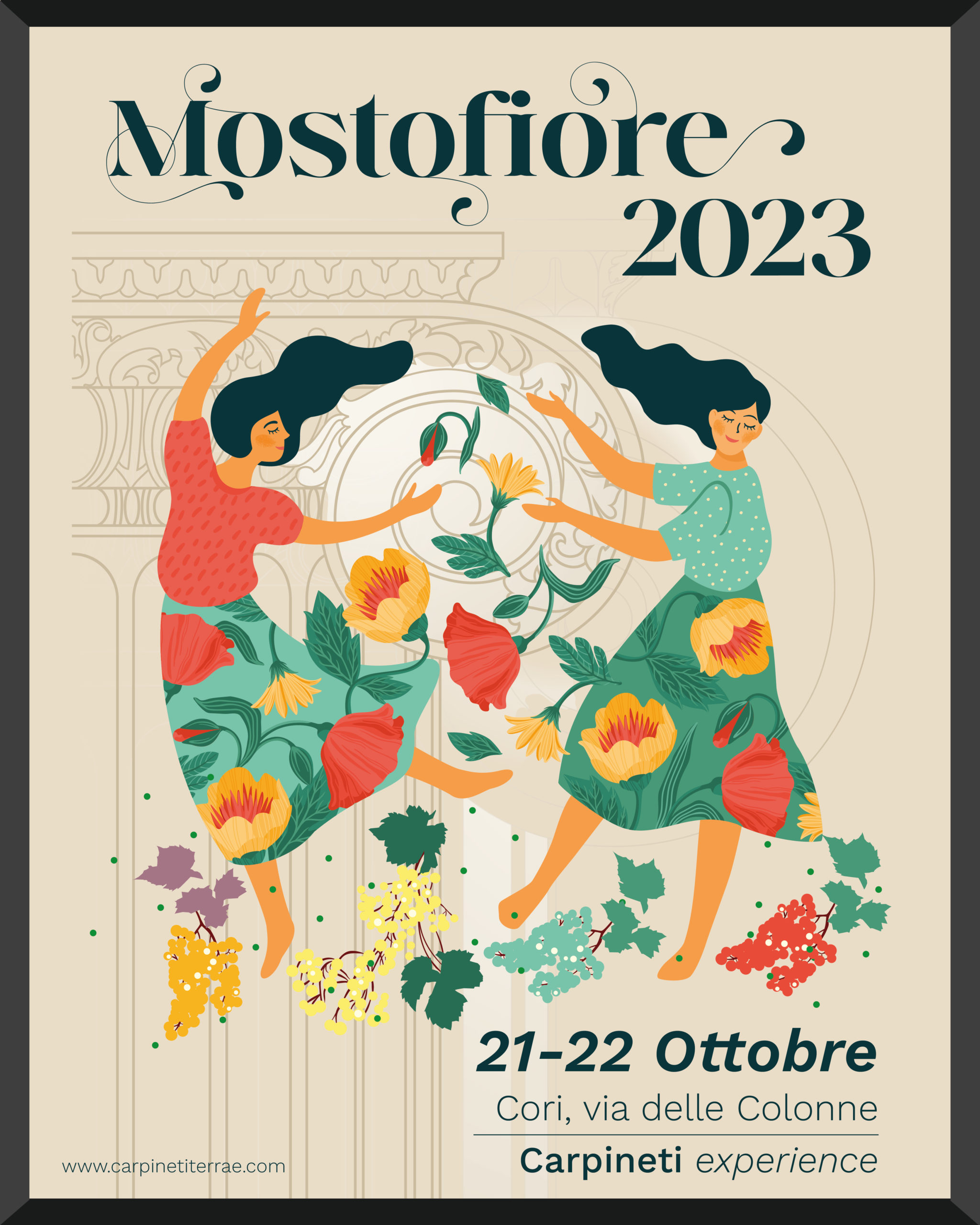La manifestazione, ideata per celebrare la fine della vendemmia, si svolgerà presso una delle vie storiche di Cori, Via delle Colonne, partendo dalla pittoresca Piazzetta Montagna e terminando al Tempio dei Dioscuri. Tra i selci e le storiche cantine sotterranee aperte per l’occasione, la via, oltre ad evocare la tradizione di Cori, è anche profondamente legata da tempo ai Carpineti. Qui, infatti, ha sede il Palazzo Carpineti, che vede i natali della famiglia.