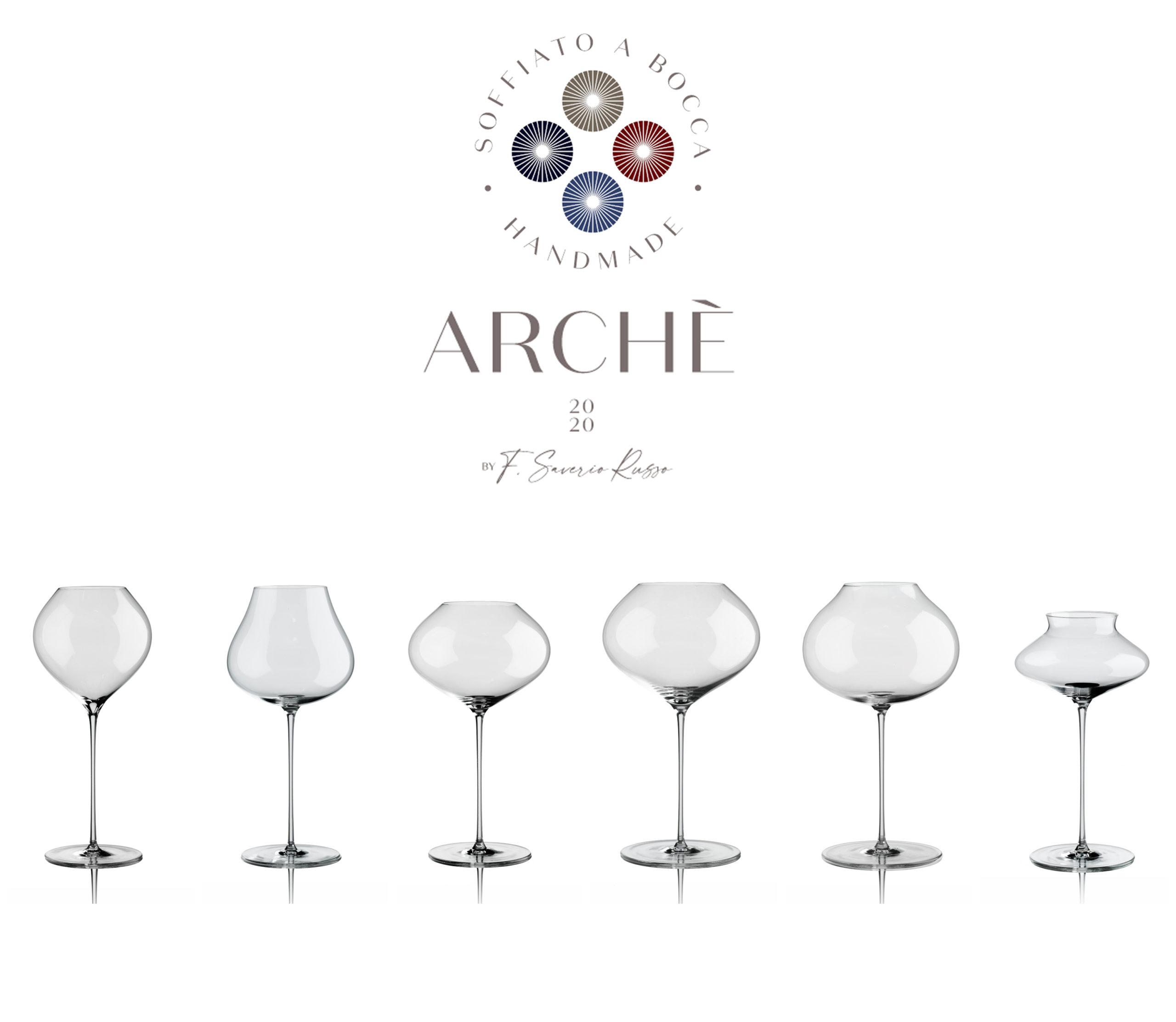 “I miei calici Archè 2020 nascono da uno studio basato sulla ricerca della massima performance tecnica unita a forme capaci di coniugare al meglio un impatto estetico raffinato e di classe alla possibilità di fruire di un’esperienza sensoriale unica nel so genere. L’obiettivo non è mai stato quello di creare uno strumento che migliori il vino. La mia volontà è quella di mettere in contatto diretto il degustatore con il contenuto, dando origine ad una concreta metonimia in cui un “calice di vino” non rappresenterà il vetro, bensì il suo contenuto in maniera integrale.” F.S.R.