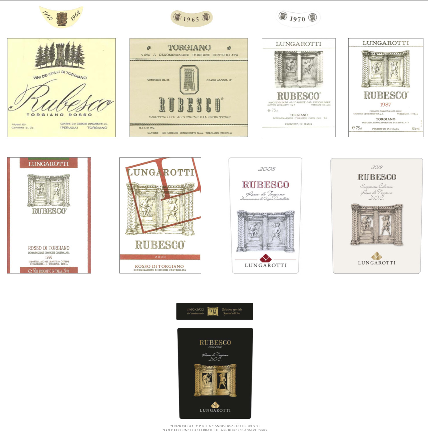 Il nome Rubesco deriva dal verbo latino rubescere, arrossire di gioia, e nasce da una felice intuizione di Maria Grazia Marchetti, moglie di Giorgio, che si ispirò a ciò che accade quando si beve un buon bicchiere di vino rosso in compagnia. La veste negli anni è variata, assecondando il gusto grafico dei tempi, ma sempre proponendo richiami forti al territorio: si va dalle primissime etichette su cui appare la torre di Torgiano, all’allegoria della vendemmia riprodotta in una delle formelle della Fontana Maggiore di Perugia di Nicola e Giovanni Pisano (sec XIII) presente sulle etichette dal 1970 ad oggi. Una scelta che ripropone quel binomio tra vino e arte tanto caro alla famiglia Lungarotti che, non a caso, già nel 1974 inaugurò a Torgiano il Museo del Vino (MUVIT) definito dal New York Times come “il migliore in Italia” per la qualità delle collezioni artistiche esposte.