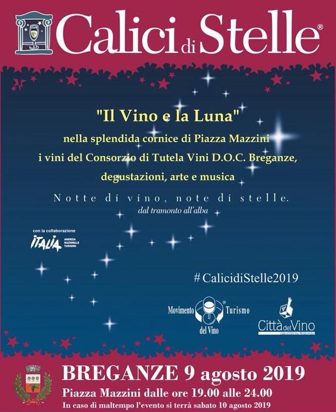 Breganze brinda alla notte di San Lorenzo. Venerdì 9 agosto 2019 in Piazza Mazzini a Breganze (Vicenza) torna Calici di Stelle, la manifestazione promossa a livello nazionale dal Movimento Turismo del Vino e dall’Associazione Città del Vino e realizzata grazie alla collaborazione tra il Consorzio Tutela Vini D.O.C. Breganze, la Strada del Torcolato e dei vini D.O.C. Breganze, la Pro Loco e il Comune di Breganze. Dalle 19.00 alle 24.00 dieci aziende consortili porteranno in degustazione i loro vini, che sarà possibile accompagnare con le migliori specialità gastronomiche del territorio della pedemontana veneta.