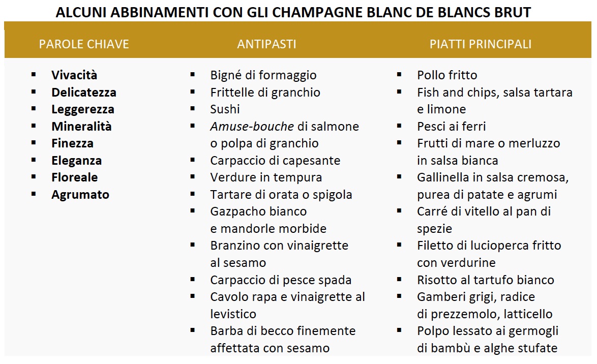 Blanc de blancs Brut: Vivacità, delicatezza e leggerezza caratterizzano questi Champagne, prodotti esclusivamente da uve a biacca bianca. Sono caratterizzati dagli aromi delicati, arricchiti da note floreali, talvolta minerali. Ricordano la frutta fresca ed esotica e gli agrumi, ma anche la menta e le mandorle. Si sposano perfettamente con sushi e fish and chips, ma anche con piatti importanti come risotto al tartufo bianco e carré di vitello.