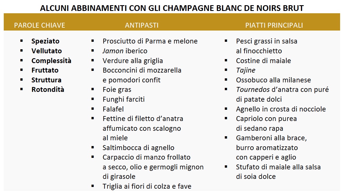 Blanc de noirs Brut: Composti al 100% da vitigni a bacca nera – pinot noir e meunier – gli Champagne blancs de noirs hanno una struttura ampia e ricca e rivelano aromi potenti e contrastanti di frutta secca, spezie, grano maturo, miele, legno, cuoio, di affumicato o addirittura di torrefazione. Sono Champagne potenti e corposi, amano le carni saporite e le consistenze morbide e sono capaci di esaltare molti grandi classici, dal foie gras all’ossobuco alla milanese, dai saltimbocca di agnello al tajine.