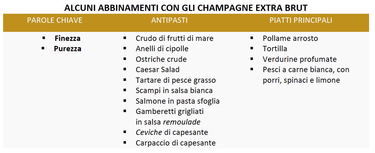 Champagne poco dosati (extra brut, pas dosé): Il basso contenuto di zucchero (tra 0 e 6 grammi per litro) dona a questi Champagne un tocco deciso, dalla marcata impronta di acidità. Ideali per l’aperitivo, ma non solo. Sono l’abbinamento perfetto per ostriche e crudi di frutti di mare, così come scampi in salsa bianca e carpaccio di capesante.