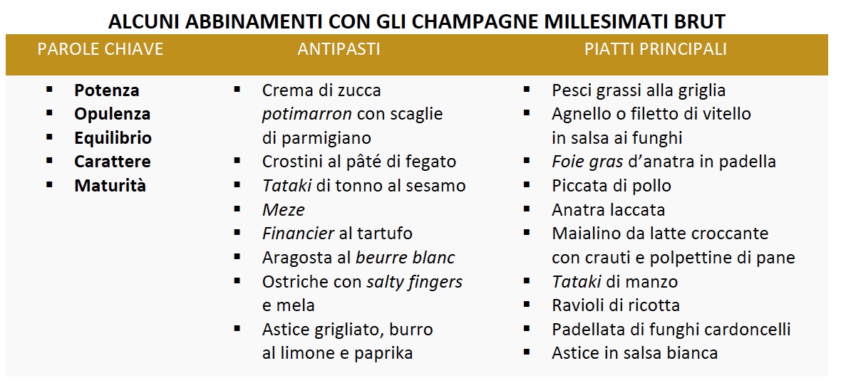 Millesimati Brut: In alcuni casi, i vini assemblati appartengono tutti a una sola e unica annata. La decisione di millesimare o meno un vino spetta al solo elaboratore, il quale può decidere che la pronunciata tipicità di una vendemmia meriti di essere esaltata. Uno Champagne millesimato sarà sempre un vino di carattere, contraddistinto dall’annata di produzione. Possono essere abbinati all’anatra laccata o all’aragosta al beurre blanc, a pesci grassi alla griglia o all’agnello in salsa ai funghi.