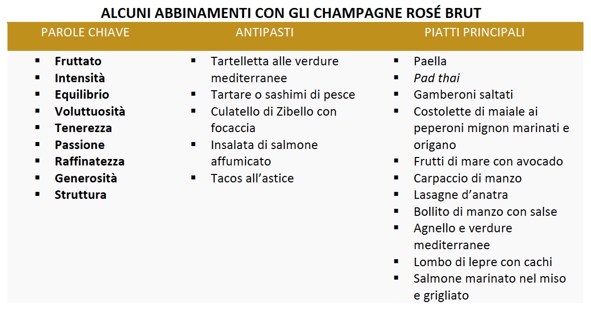 Rosé Brut: Tenerezza, passione, raffinatezza, generosità: sono solo alcune delle sensazioni che richiamano gli Champagne rosé che possono essere ottenuti per macerazione o per assemblaggio. I rosé morbidi e delicati si sposano ai sapori più rotondi, quelli freschi e leggeri si rivelano soprattutto con aromi floreali e fruttati; ai Rosé potenti e strutturati si riservano gusti più marcati e corposi, mentre quelli complessi e maturi sono da affiancare a piatti poco lavorati. Qualche esempio? Culatello di Zibello con focaccia, paella, pad thai thailandese e carpaccio di manzo.