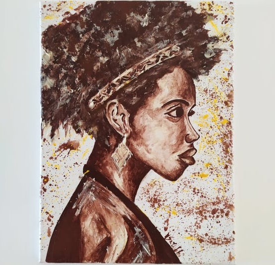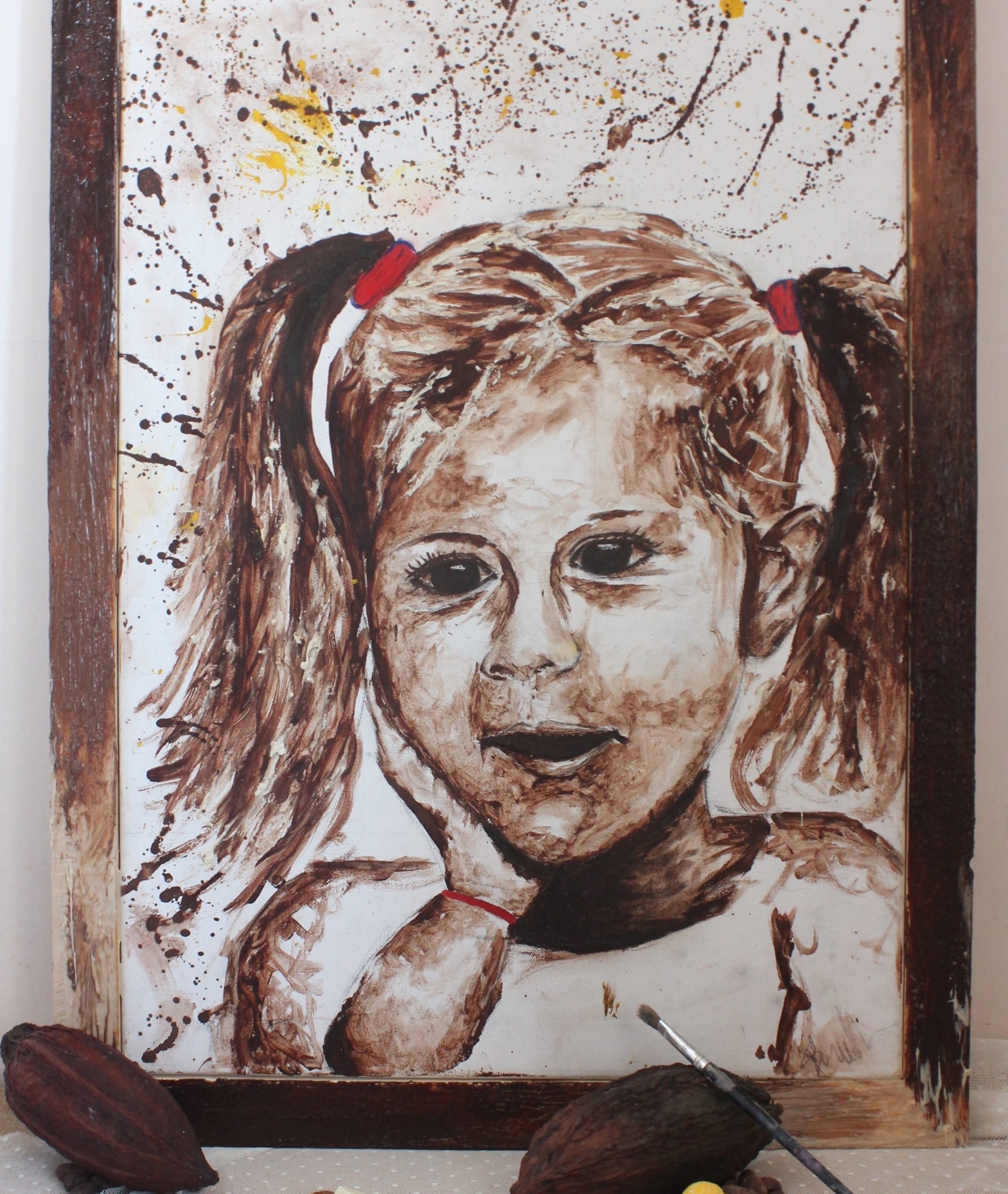 “Volevo che sulla tela rimanesse l’impronta del cioccolato come quella che inevitabilmente rimaneva sui miei grembiuli bianchi che usavo al lavoro.” – racconta Martina – “Il mio primo lavoro è stato più che altro una prova, non esistendo tecniche di pittura con il cioccolato, ho iniziato a sperimentare, pennellata dopo pennellata, come questa materia potesse reagire e rimanere in modo indelebile sulla tela. La mia prima opera è stata un po’ deludente perché dipingere con il cioccolato non è la stessa cosa che dipingere con degli oli o con gli acrilici ed inoltre, avendo un monocolore, bisogna lavorare di chiaro-scuro per far “parlare” i soggetti. Ho iniziato quindi a fare svariate prove utilizzando il cioccolato temperato, quello non temperato, facendo attenzione ai difetti del cioccolato non temperato e sfruttandoli in alcuni casi come pregi, e la semplice polvere di cacao. Così sono venute fuori le diverse miscele che ad oggi utilizzo per dare le sfumature e le diverse colorazioni alle mie opere.  “Alis” è il mio primo lavoro ed è il volto di una dolce e tenera bambina di famiglia e mi piace definirlo il Mio Manifesto.  Come tema iniziale ho scelto quello dei bambini perché mi piace associarli al cioccolato per la loro dolcezza, genuinità e semplicità. In seguito, sono nate nuove tele incentrate sui bambini, sulla maternità e sulla figura femminile che esprimono la passionalità e la sensualità che accomuna una donna al cioccolato. Ad oggi posso dire che anche il “tema afro” si sposa molto bene con il mondo del cioccolato e lo valorizza.”