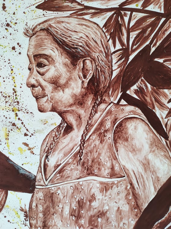 Donna Demetria” , un’anziana signora di 90 anni che lavora ancora oggi nelle piantagioni di cacao messicane. Questo quadro  è stato esposto nello stand di Silva Cacao all’ultima Salon du Chocolat 2019 di Parigi.