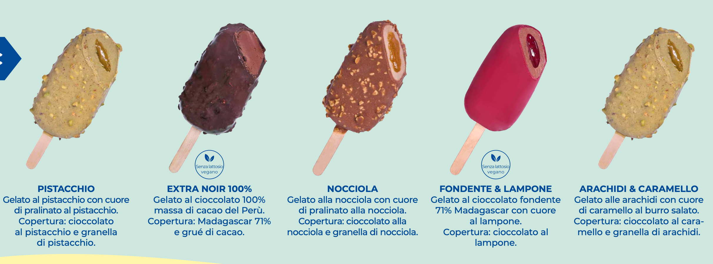 • Arachidi & Caramello, gelato alle arachidi con cuore di caramello al burro salato e copertura di cioccolato caramellato con arachidi e granella di arachidi.