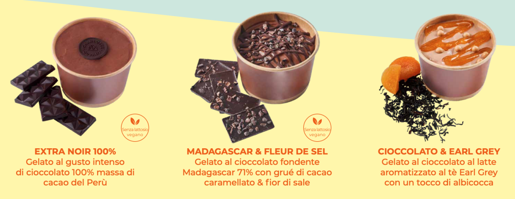 • Extra Noir 100%, gelato al gusto intenso di cioccolato 100% massa di cacao del Perù (vegano).