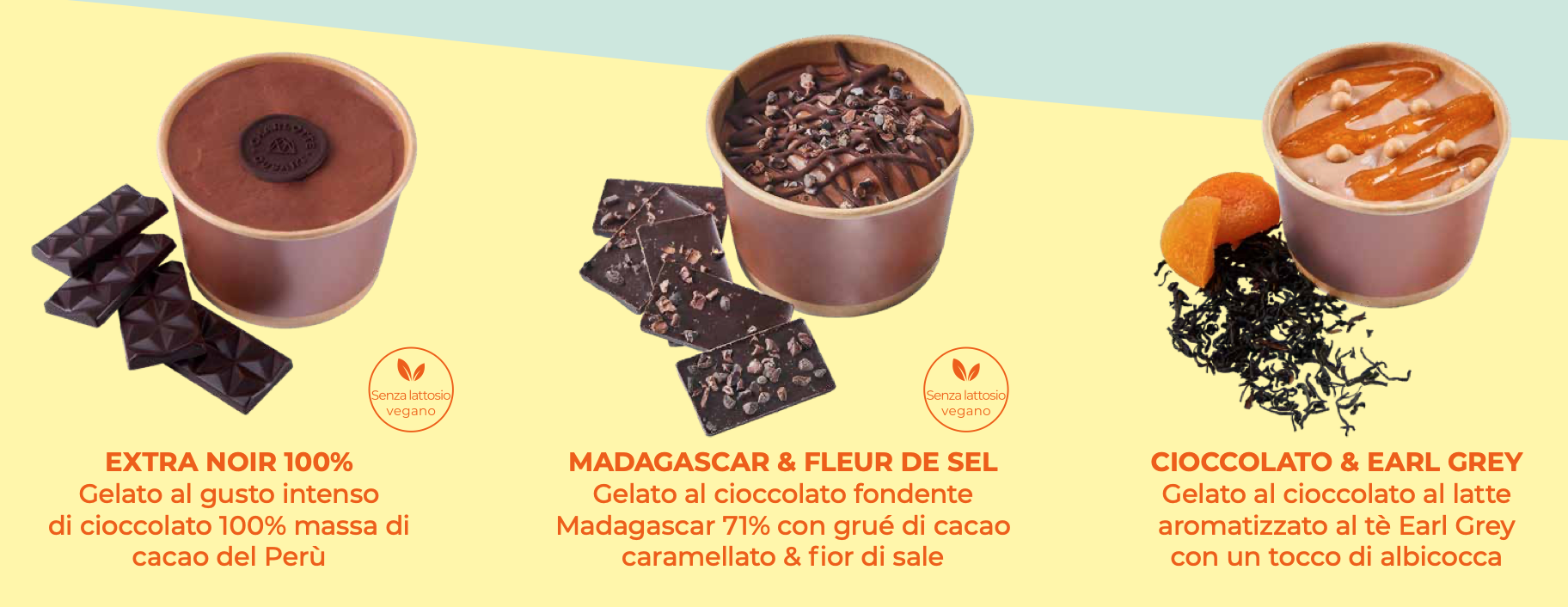 • Extra Noir 100%, gelato al cioccolato 100% massa di cacao del Perù e copertura di: Madagascar 71% e grué di cacao (vegano).