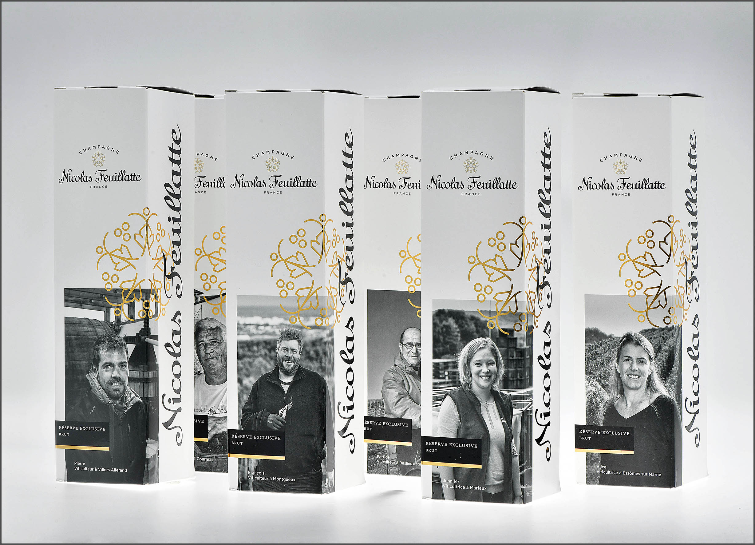 Questo progetto è nato con il meraviglioso ritratto collettivo realizzato dal fotografo Michel Jolyot, non meno champenois, che ha percorso tutta l’area di denominazione della Champagne per incontrare i protagonisti di Nicolas Feuillatte, gli uomini e le donne che coltivano i 2100 ettari di vigne dove vengono raccolte le uve delle sue pregiate cuvées, e poterne fermare un sorriso, un’espressione, uno sguardo attraverso uno scatto.