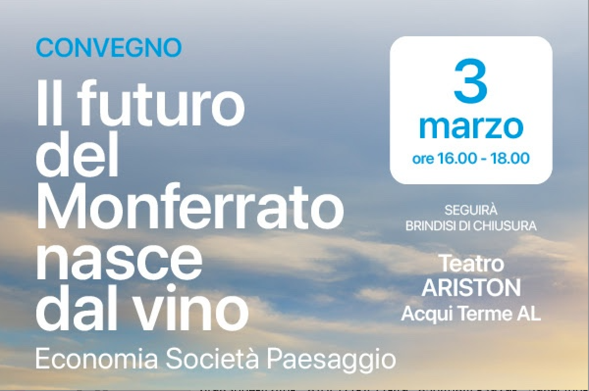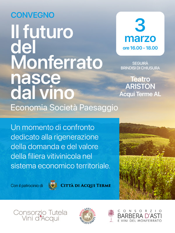 L’appuntamento è fissato per martedì 3 marzo 2026, dalle ore 16.00, presso il Teatro Ariston di Acqui Terme, con il convegno “Il futuro del Monferrato nasce dal vino – Economia, società, paesaggio”, un evento che segna l’avvio di un percorso di sviluppo e valorizzazione dell’area, condiviso daConsorzio Tutela Vini d’Acqui, Consorzio Barbera d’Asti e Vini del Monferrato e Consorzio per la Tutela dell’Asti Spumante e del Moscato d’Asti DOCG. L’iniziativa supera la dimensione della singola denominazione per adottare una visione integrata e sistemica, puntando a far riconoscere nella filiera vitivinicola il baricentro economico, sociale e culturale del territorio.