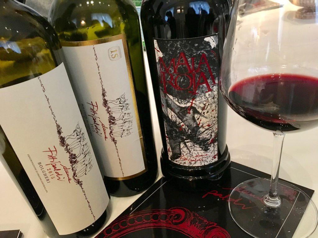 Bolgheri Doc Superiore 2013: 30% Cabernet Sauvignon, 30% Cabernet Franc, 30% Merlot, 10% Petit Verdot. Al naso un fruttato dolce e intenso la fa da padrone segue un sottofondo di note balsamiche e speziate. Un vino di grande complessità e struttura; in bocca i tannini sono levigati, setosi e avvolgenti; ben percepibile la nota dolce della glicerina che avvolge il tutto. Una gradazione sicuramente elevata, 15% vol., ma perfettamente integrata; è proprio il caso di dirlo: “ quindici gradi e non sentirli!”.