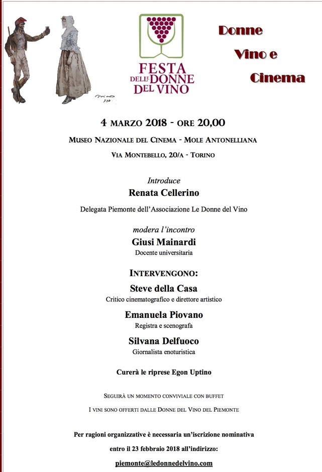 In Piemonte la Delegata Renata Cellerino ha organizzato per il 4 marzo al MUSEO NAZIONALE DEL CINEMA a Torino un interessante dibattito con tema: “Il vino nel cinema: un’immagine spesso in chiaroscuro. Ma con la presenza femminile nasce il rapporto con la terra, la vigna, il paesaggio…”