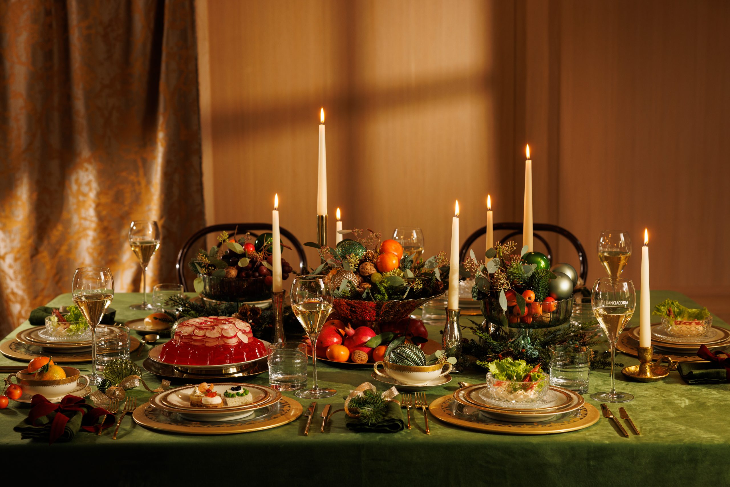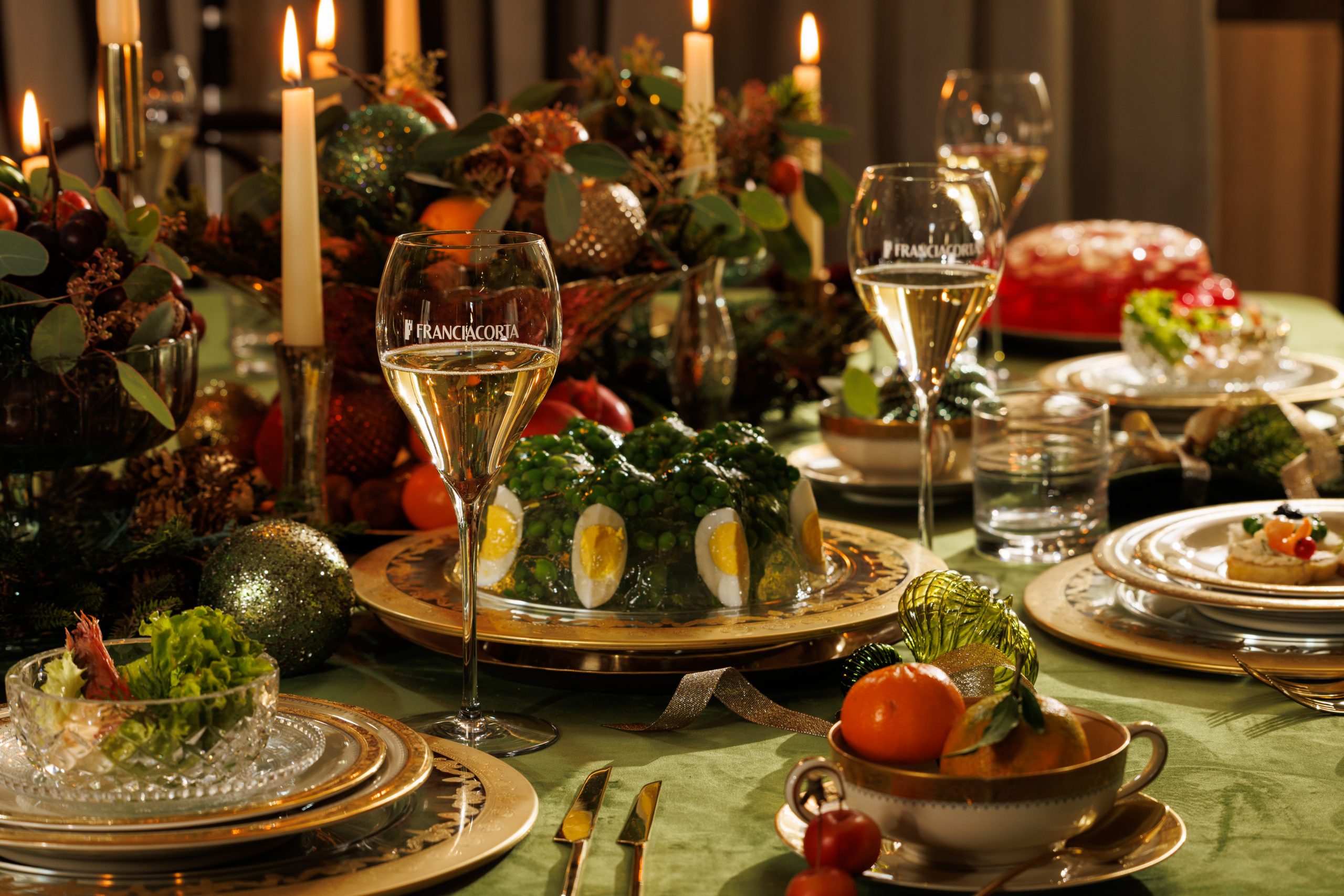 La tavola del Natale 2025 secondo Franciacorta è un viaggio nella memoria collettiva: velluto verde, candele dorate, cristalli, servizi importanti e portate scenografiche.