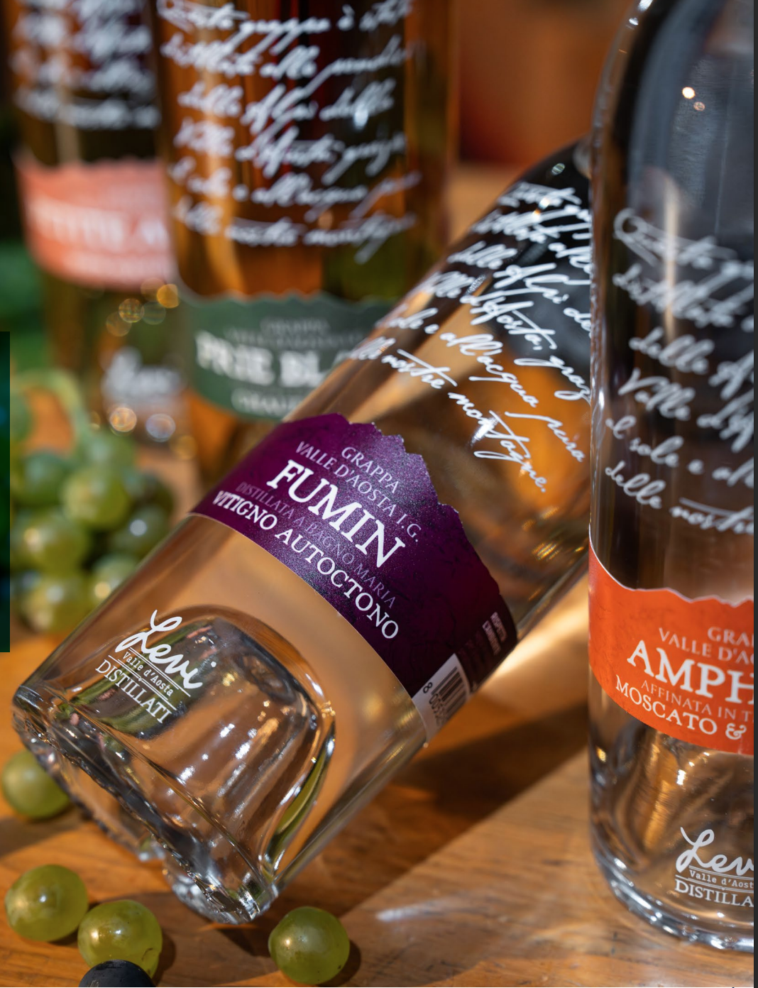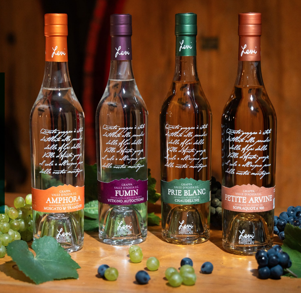 Nasce così Grappe Levi 2025, una nuova uscita composta da quattro grappe che trasformano la montagna in esperienza sensoriale, seguendo un filo narrativo che parte dai vitigni e arriva alle scelte di affinamento. Tre etichette valorizzano vitigni emblematici della Valle d’Aosta (Prié Blanc, Petite Arvine, Fumin), mentre una celebra la ricchezza dei vitigni aromatici Traminer e Moscato.