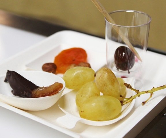 Il piatto o meglio la frutta scelta per l’abbinamento: uva bianca fresca, nocciole sgusciate, albicocche disidratate, scorze d’arance candite ricoperte di cioccolato e ciliegie sotto grappa di Moscato.