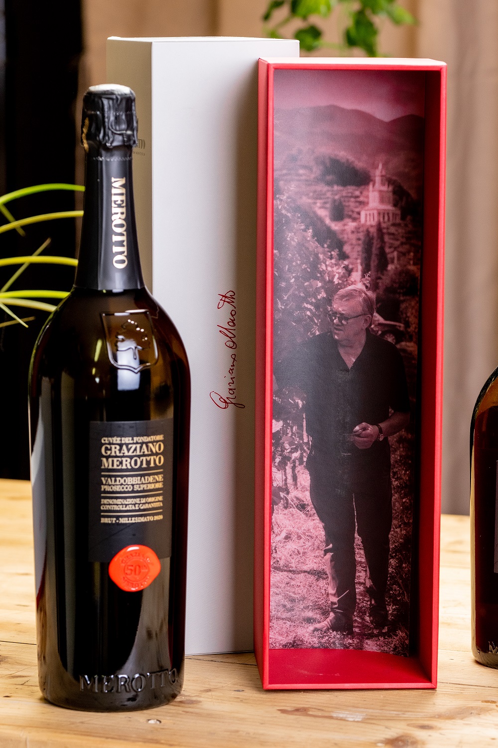 La Cuvèe del Fondatore Graziano Merotto, Valdobbiadene Prosecco Superiore DOCG Brut Millesimato 2020 Edizione 50°, contraddistinta dal sigillo in ceralacca rosso, rappresenta simbolicamente la summa della storia di quest’uomo e dei 50 anni di vita dedicata alla ricerca per ottenere il meglio dallo splendido territorio di Conegliano Valdobbiadene.