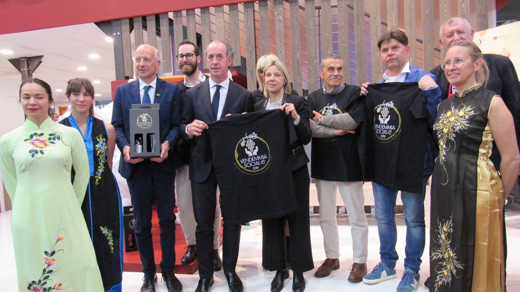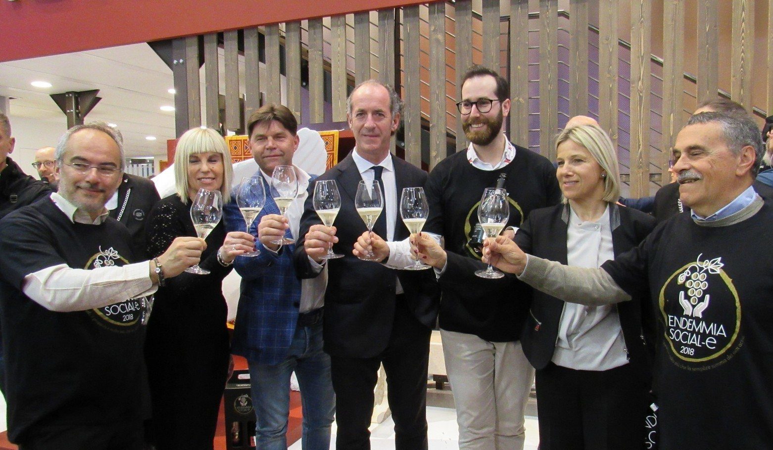 Brindisi e solidarietà ieri a Vinitaly, nello stand della Regione Veneto, con l’apertura della prima bottiglia prodotta grazie alla Vendemmia Social-e 2018.