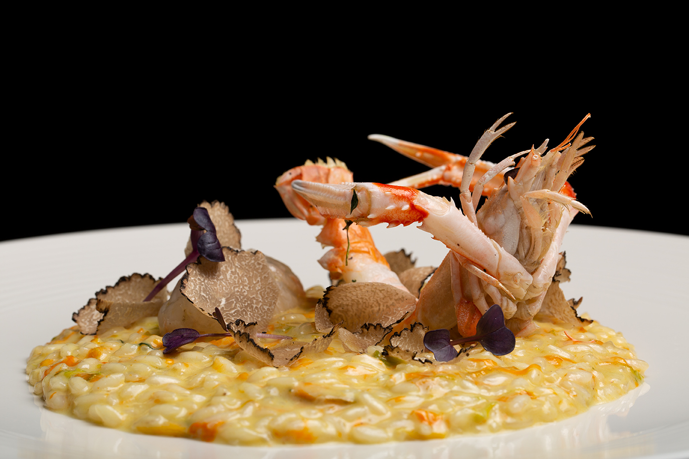 RISOTTO FIORE DI ZUCCA CON TARTARE DI SCAMPI E TARTUFO