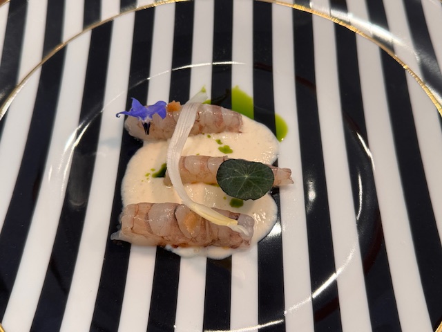 Si parte con un Crudo di mazzancolle: mazzancolle nostrane, asparago bianco, limone fermentato, yogurt ed erba cipollina. Un piatto che sa di mare dove la freschezza e la semplicità si esaltano a vicenda.