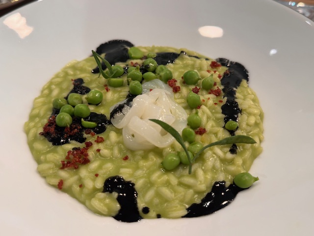 Non poteva mancare Risi e Bisi: riso del Delta, piselli e seppia, patanegra e finocchietto marino. Un piatto della tradizione reinterpretato in chiave moderna con un tocco internazionale.
