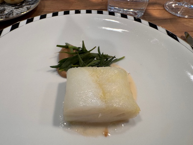 Baccalà dissalato: baccalà, cavolfiore bruciato, erbette selvatiche della laguna e beurre blanc. Qui il baccalà, storicamente protagonista della «cucina povera», diventa prelibatezza. Un piatto all’apparenza dal gusto “forte” ma che sorprende per la sua delicata armonia di sapori.