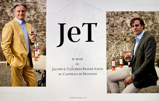 Nella tenuta del Castello di Montepò a Scansano Jacopo e Tancredi Biondi Santi hanno deciso di dar vita ad una nuova espressione del Sangiovese Grosso BBS11 nel rispetto della secolare tradizione di famiglia nella terra di Maremma: un rosato fresco e profumato che non perda l’integrità del Sangiovese e che possa riposare in bottiglia e preservarsi negli anni. JeT, questo il nome scelto, un progetto che vede per la prima volta la collaborazione di Jacopo e Tancredi Biondi Santi, e che non poteva non portare le loro iniziali.