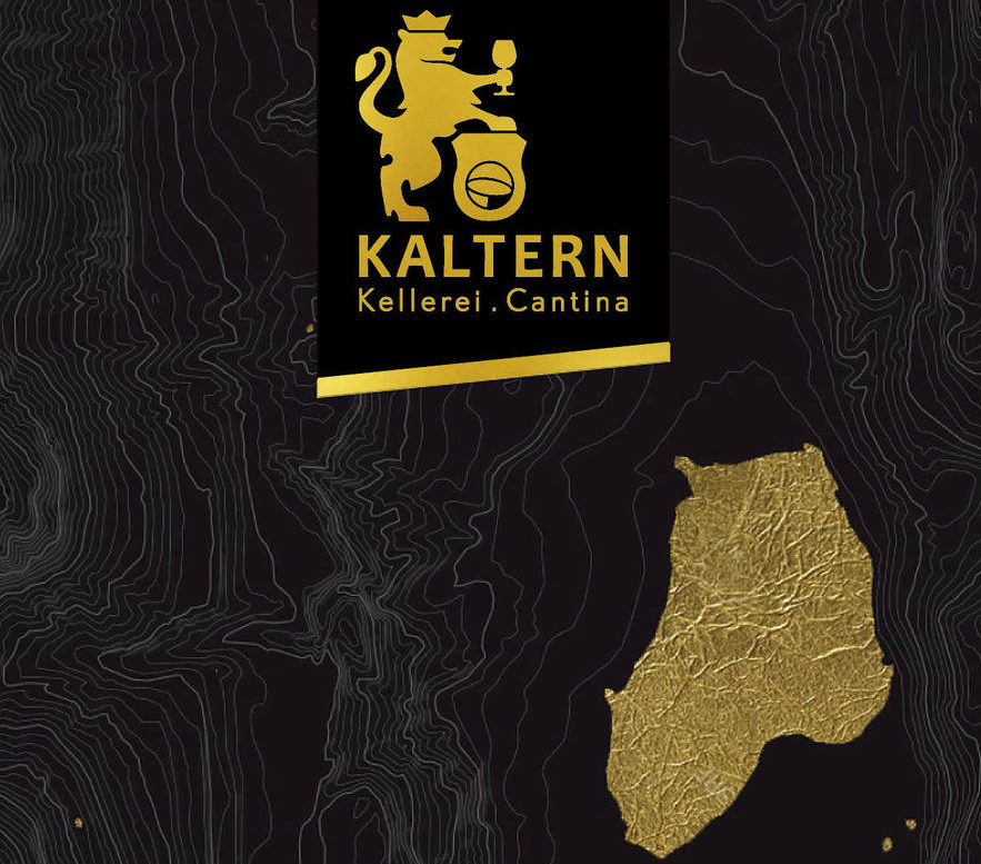 acquista spessore e importanza grazie al fondo nero che racconta il territorio attorno allo specchio d’acqua, seguendone le altimetrie con sottili curve di livello. E dorato è anche il logo di Cantina Kaltern, in cui convivono il leone asburgico simbolo della Cantina del Giubileo ed il paiolo della polenta che rappresenta quella dei Contadini. Dalla loro unione, nel 1992, nacque la Cantina Kaltern che oggi, dopo la fusione a fine 2016 con l’altra grande cooperativa Erste+Neue, è il più importante produttore di Kalterersee Doc.