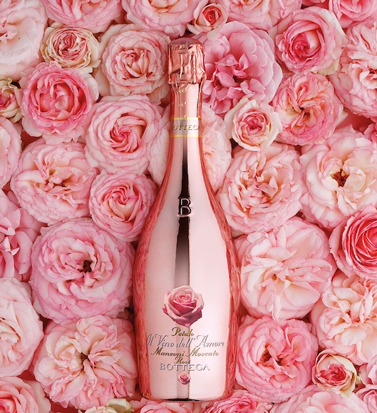 La bottiglia di colore rosa acceso viene realizzata con un esclusivo procedimento di metallizzazione della superficie esterna del vetro e rientra a pieno titolo nella collezione degli spumanti Bottega. L’etichetta, che raffigura una rosa in piena fioritura, evoca l’aromaticità del vino.