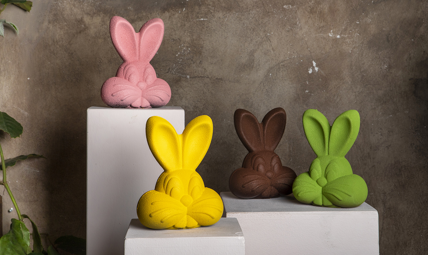 Il primo a farsi notare è senz’altro il Frau coniglio, in cioccolato fondente Frau Knam Señorita 72, disponibile in diversi allegri colori primaverili: verde, rosa, giallo e, il classico, fondente.
