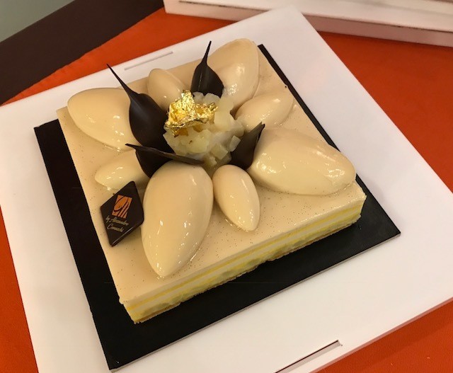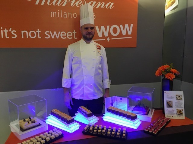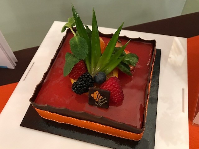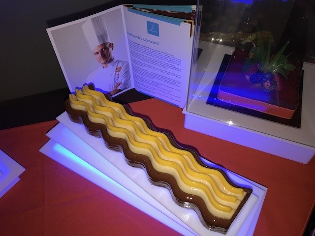 Poseidon: creazione personale di Alessandro Comaschi e vincitrice al Sigep di Rimini 2018 dei premi come “Miglior entremets al cioccolato” e “Migliore ricetta tecnica”, la Poseidon è un trionfo di cioccolato. Sablé e cremoso al manjari, pan di spagna e bignè alla massa di cacao, bagna al cioccolato manjari del Madagascar, namelaka alla mandorla e namelaka mango e passion fruit, mousse manjari e guanaja della Francia e glassa fondente sono gli ingredienti di questa golosissima torta, raffinata e potente.