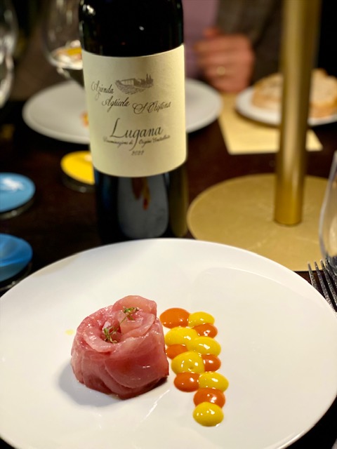 La serata è proseguita con la cena ideata e curata da Edoardo Traverso, Executive Chef dell’Hub Identità Golose Milano. Ogni piatto è stato studiato per esaltare le caratteristiche dei vini in abbinamento: Fiore di Ricciola, antipasto, emulsione di pomodoro datterino e finocchietto è stato scelto Lugana DOC Santa Cristina di Zenato; Spaghettino mantecato con emulsione all’astice e limone con Lugana DOC di Tenuta Corbari; Petto di Faraona su fondo rosa di patata e dragoncello due vini tra cui scegliere Lugana DOC Riserva Antico Vigneto di Corte Anna e Lugana DOC L’artigianale di El Citera. La cena si è conclusa con il Cremoso al cioccolato ivoire, mango e lime, accompagnato da un inaspettato cocktail sempre a base di purea di mango e Vodka.