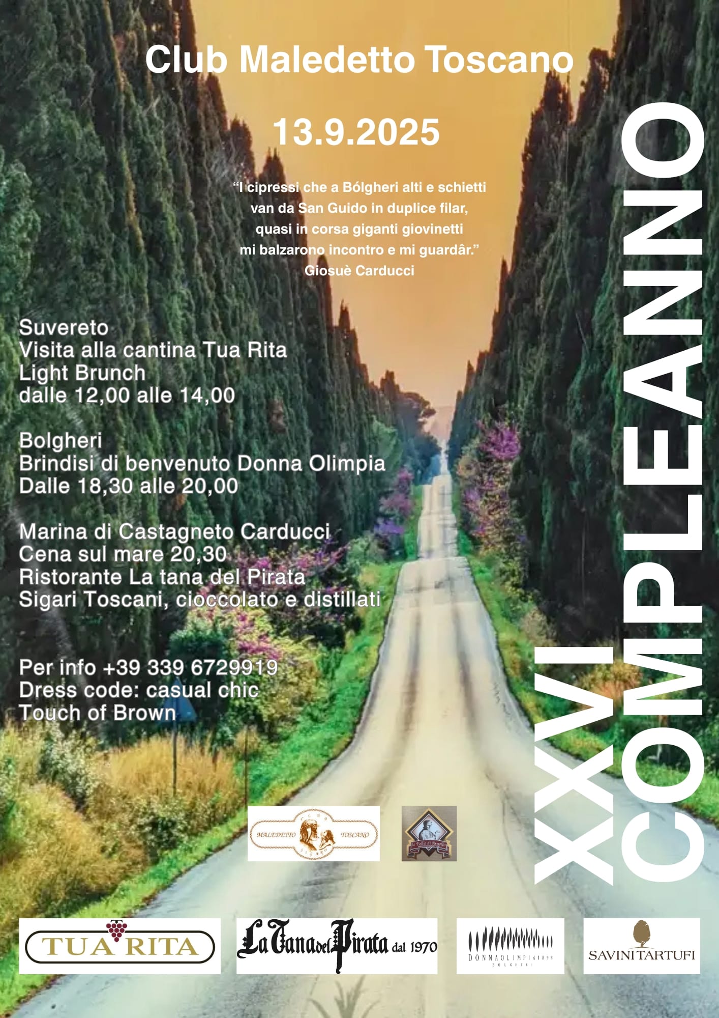 Il ricco e lungo programma della giornata. Per festeggiare i ventisei anni, il Club Maledetto Toscano ha deciso di coinvolgere tutti gli appassionati sabato 13 settembre. Si parte dal mattino, alle ore 12, con la visita alla Cantina Tua Rita di Suvereto dove in abbinamento ai vini della tenuta sarà servito anche un light brunch. Nel pomeriggio, alle 18.30, l’appuntamento è a Bolgheri con il brindisi di benvenuto da Donna Olimpia. La cena si svolgerà invece sul mare, al ristorante La tana del Pirata di Castagneto Carducci dove Stefania e Paolo Pani accoglieranno gli ospiti a partire dalle 20.30. Dopo l’aperitivo a bordo piscina, una cena dedicata al mare con tre piatti. A seguire poi la meditazione, le stelle e la convivialità. Direttamente dal Caveau del Maledetto Toscano di Foiano della Chiana una selezione di sigari di grande livello e valore storico. In queste tre occasioni saranno come sempre coinvolti partner storici e nuovi che hanno in questi anni partecipato alle iniziative del club. In particolare, per la cena saranno presenti i tartufi di Savini Tartufi, poi la Cioccolateria di Arnolfo da Colle di Val d’Elsa con tre tipologie di cioccolato: uno al sale di Volterra, uno al gusto Cipresso e una con il vino, in perfetta toscanità. Si potrà scegliere di partecipare ai singoli appuntamenti o a tutta la giornata. Per informazioni e prenotazioni contattare il numero 339 6729919.