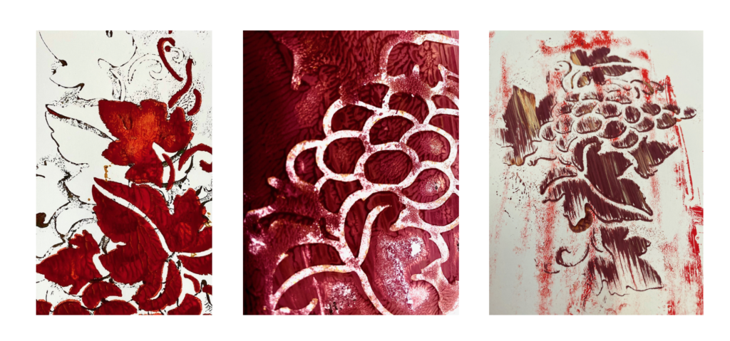 È stata utilizzata una tecnica basata su stencil e stratificazioni di colore, senza l’uso del pennello, creando così illustrazioni di foglie, tralci e grappoli d’uva in cui risaltano i dettagli. Tra le tre etichette una in particolare esprime il legame con la natura e il sentore ammandorlato del vino, con l’immagine del mandorlo e le sue foglie, dai caldi toni autunnali.