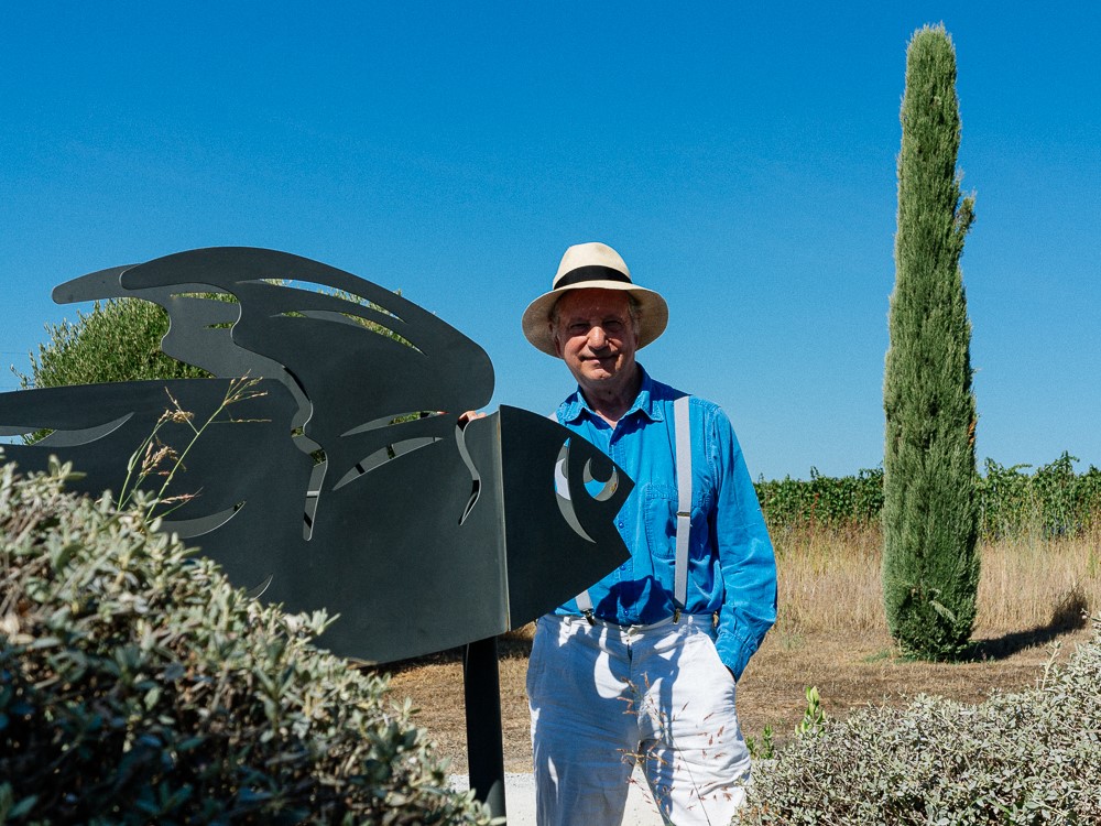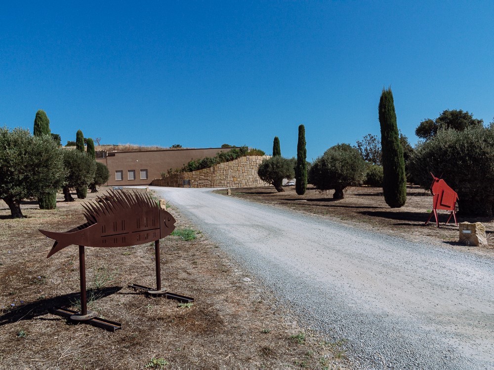 Ecco dunque che dal ricamo delle suggestioni 2020, guizzano fuori due opere affascinanti, due pesci reali ed onirici al tempo stesso: il Pesce Angelo e il Pesce Istrice. Fedeli nella forma del corpo, rivelano dettagli che li trasformano e – nomen omen – ne definiscono l’essenza: ali spiegate al posto delle pinne il primo e aculei appuntiti il secondo. Pesci volanti perché fluttuano nell’aria, nella loro interpretazione in metallo con piedistallo che è in mostra sulle colline della tenuta. Ma volano anche con la fantasia, perché è da lì che hanno preso vita. “Sono nati all’improvviso, come un’epifania”, racconta Bruno Pellegrino. “Il primo l’ho dipinto di getto, istintivamente, creatura solitaria nel mare delle mie suggestioni. Poi da lì è venuto fuori un flusso di colori e pesci in continuo divenire. Sono i pesci che hanno scelto me e non il contrario”. In primis, dunque, pesci dipinti ma con una forza espressiva che ha spinto Pellegrino – dopo diverso tempo e diversi disegni – a dargli una forma reale. “Ho sentito il desiderio di donargli una matrice fisica ma in chiave sognante”, spiega bruno. “Ecco some sono nati i pesci volanti come statue, Pesce Angelo e Pesce Istrice. Li avevo creati per ospitarli nel mio florido giardino a Tuscania ma la verità è che rispecchiano l’aspetto brullo e mediterraneo, della Maremma”. Un connubio perfetto con Monteverro: ora sembrano sorridere dal loro piedistallo e accogliere chi visita la tenuta.