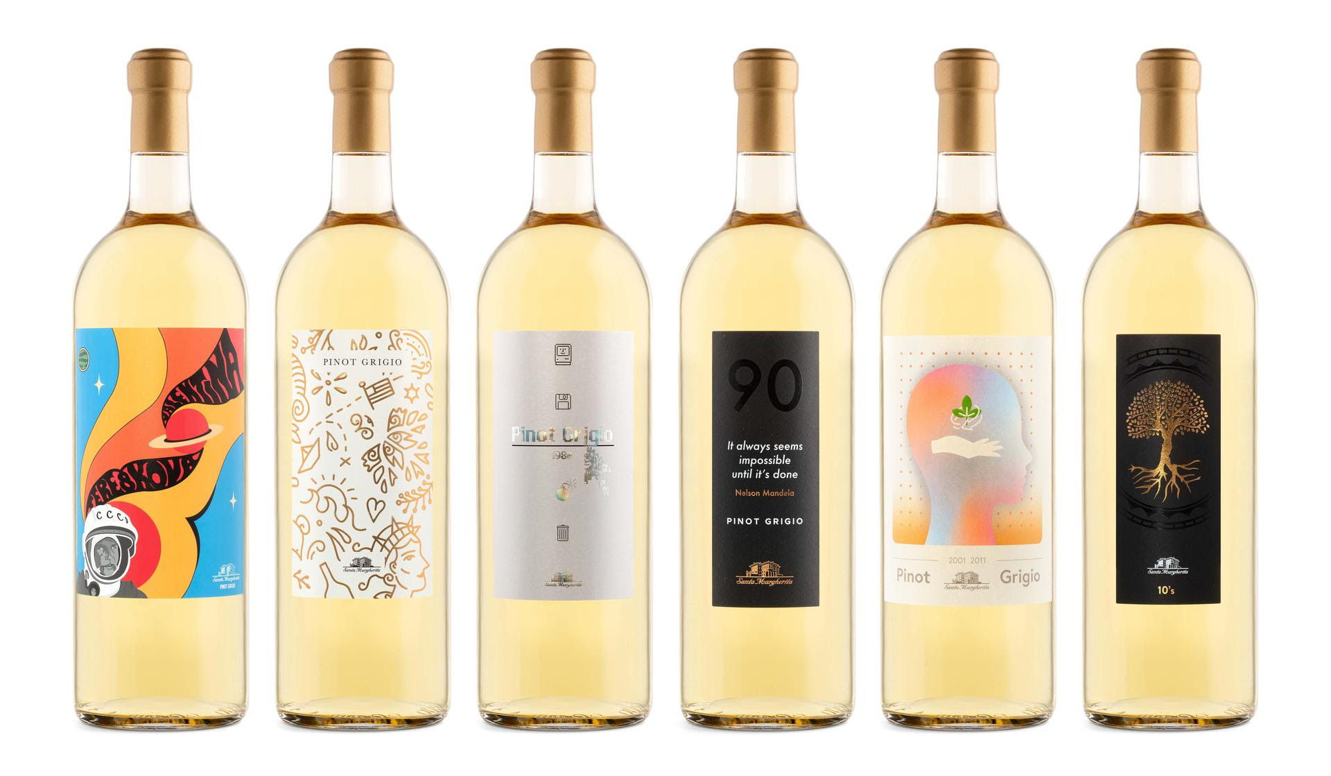 La selezione, tra ben 14 progetti originari, ha voluto premiare il legame con i valori di Santa Margherita, l’incredibile storia del suo vino-icona e, insieme, la resa grafica. Da qui nasce la Capsule Collection celebrativa di questo importante traguardo: sei grandi formati di Pinot Grigio Impronta del Fondatore, vestiti con altrettante etichette dal design inedito, ognuna in rappresentanza di una decade, dalla sua nascita ad oggi.