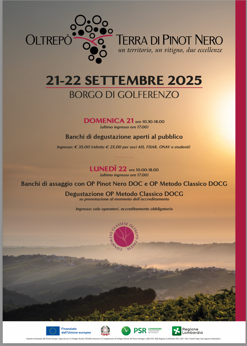 Il 21 e 22 settembre, l’Oltrepò Pavese si racconta attraverso “Oltrepò: Terra di Pinot Nero”, alla sua quinta edizione, un evento ideato dal Consorzio Classese Oltrepò Pavese al fine di creare un autentico momento di incontro tra produttori, stampa, professionisti del settore e – per la prima volta – anche gli appassionati.