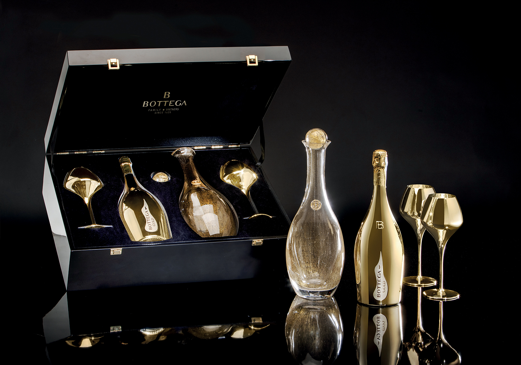 Una bottiglia in vetro soffiato di Murano, realizzata su misura e impreziosita da foglia d’oro sommersa, con tappo sferico coordinato. Si tratta di un capolavoro artigianale dal peso di 4 kg, nato dalla collaborazione tra Bottega e il maestro vetraio della Soffieria Pino Signoretto. È stato realizzato a mano nella fornace sull’isola di Murano, utilizzando le tecniche uniche e artigianali della lavorazione artistica del vetro muranese. Ogni bottiglia è numerata e firmata da Sandro Bottega, artefice del disegno originario. Si tratta pertanto di un pezzo unico, da utilizzare tanto come decanter per servire il Prosecco quanto come oggetto d’arredo, per il design elegante che lo contraddistingue