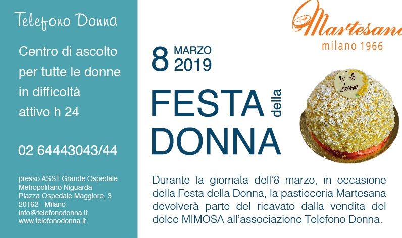 Non solo un dolce festeggiamento ma anche un sostegno concreto alle donne in difficoltà: durante tutta la giornata di venerdì 8 marzo nelle tre Pasticcerie di via Cagliero, via Sarpi e Piazza Sant’Agostino, acquistando una torta Mimosa devolverete una parte della vostra spesa all’Associazione Telefono Donna, centro di ascolto per tutte le donne che hanno bisogno di aiuto.